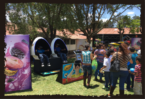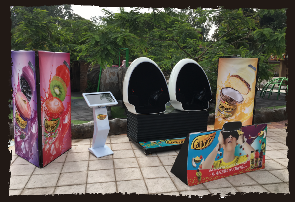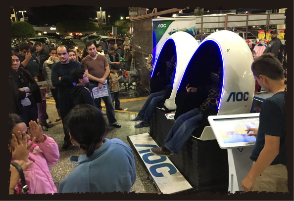Cabinas de realidad virtual, cuentan con lentes que te dan una vision en 360° del video reproducido, sillones con movimiento inteligente, audio estereo. Tecnologia de punta con mas de 95 videos diversos, estos variables en tiempo y publico objetivo.