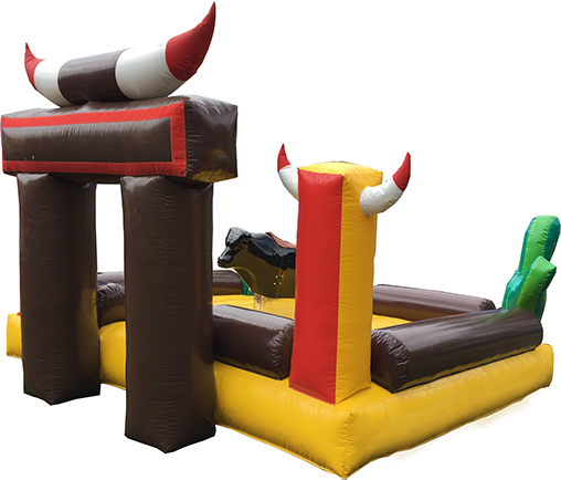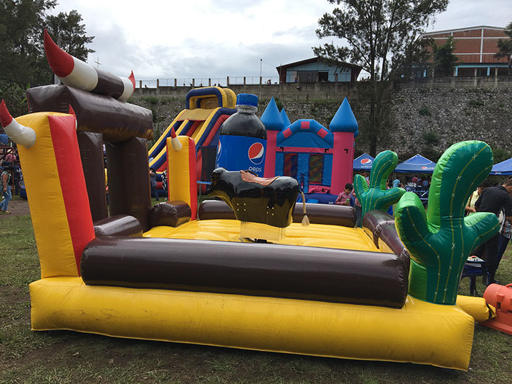 Inflable con una replica de toro en la parte central, donde los participantes intentaran domar al toro que se mueve aleatoreamente y con diversas intensidades.